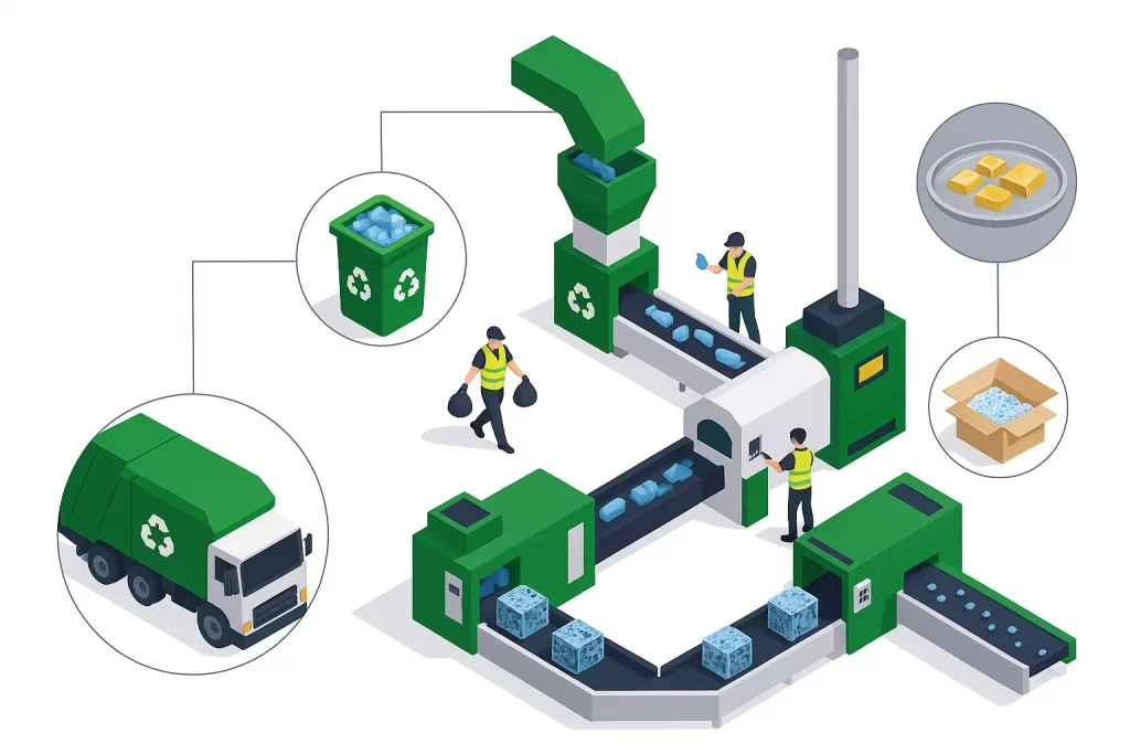 Designed to handle diverse e-waste, batteries, and solar modules, it combines precision, automation, and eco-conscious practices to maximize resource recovery while minimizing environmental impact.